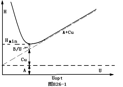 圖B26-1 為H-u曲線,曲線上Hmin對應最佳線速度Uopt,根據柱長L與塔板高度H的關系,理論塔板數n=L/H,在給定條件下,若在最佳流速下進行操作,可獲得最高柱效。在曲線的最低點,塔板高度H最小(H最?。?。