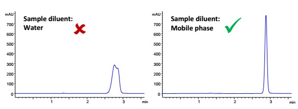 當使用親水相互作用液相色譜法(HILIC)時,樣品稀釋劑的選擇對峰形有顯著的影響。稀釋劑的錯誤選擇可能會導致色譜峰形差,峰分裂和保留時間的不穩定。