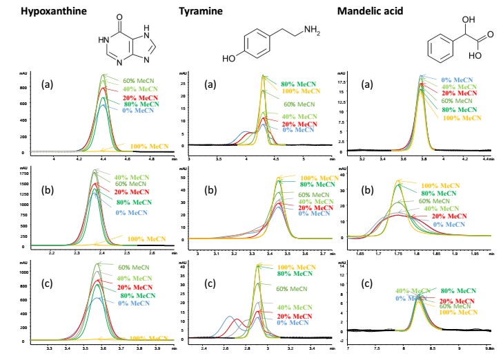 圖2:次黃嘌呤、酪胺和扁桃酸在(a)ACE 5 HILIC-N、(b)ACE 5 HILIC-A、(c)ACE 5 HILIC-B,150 x 4.6mm。在乙腈:水(90:10 v/v)甲酸銨調溶液pH 3.0。流速:1.5mL/min。溫度:25℃。檢測器:UV,254nm。進樣量:5uL。