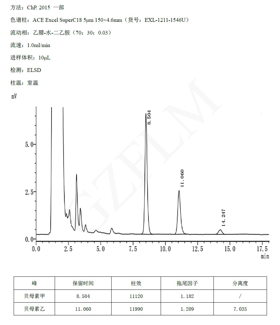 ACE SuperC18色譜柱由于其獨(dú)特的封裝鍵合技術(shù),顯著增加了硅膠表面的配體覆蓋率,并有效消除了分離中的未鍵合硅醇基的影響。當(dāng)在分析堿性分子時(shí),這種超惰性的色譜柱可以提供優(yōu)異的峰形和柱效。下圖分別為浙貝母中貝母素甲和貝母素乙的測定、通絡(luò)骨質(zhì)寧膏中青藤堿的測定。