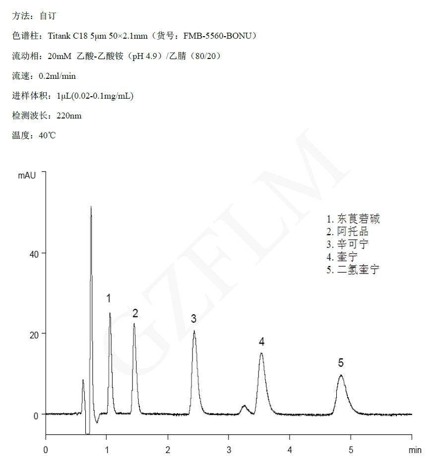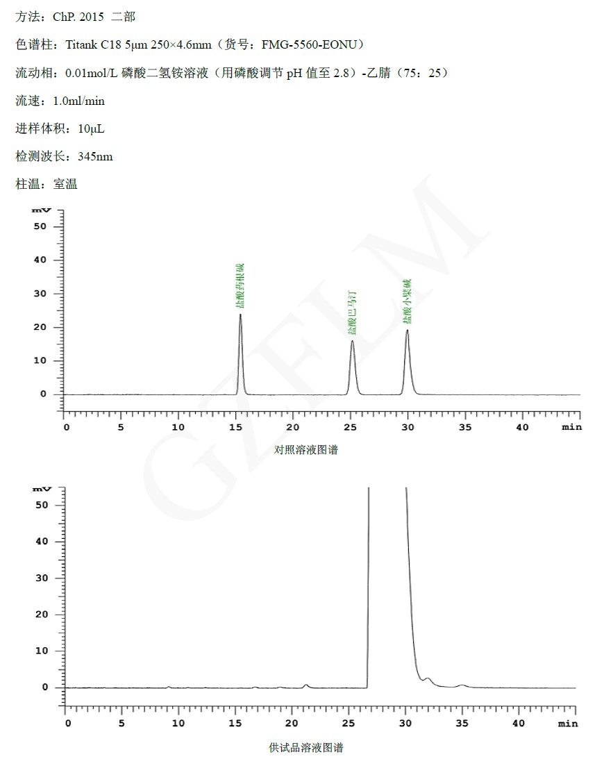 Titank C18有機(jī)硅膠雜化色譜柱,是在硅膠的硅氧網(wǎng)狀構(gòu)造中以更加穩(wěn)定的烷基來取代在堿性條件下不穩(wěn)定的硅氧橋連接,具有寬pH耐受范圍(1-12)、低背壓和100%水相穩(wěn)定的特點(diǎn),對(duì)于較大極性的物質(zhì)有很好的保留。下圖分別為幾種生物堿的分析、鹽酸小檗堿的有關(guān)物質(zhì)。