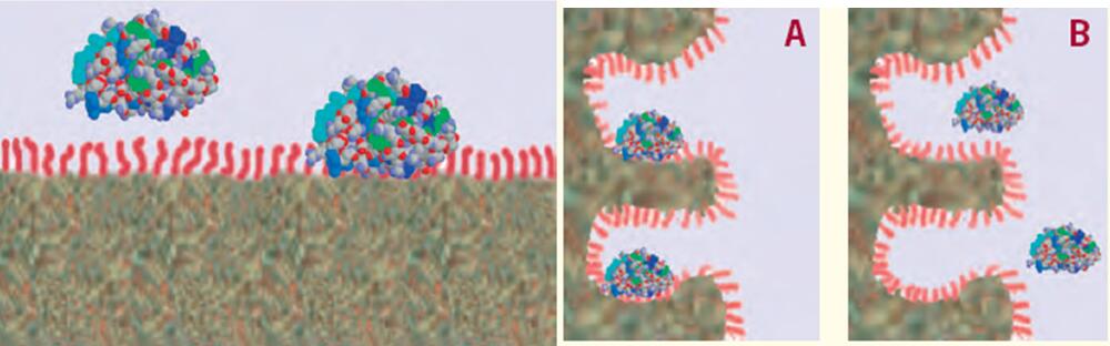 大部分蛋白質位于表面上方與流動相接觸(蛋白質的大部分是在疏水面之上與流動相接觸)。