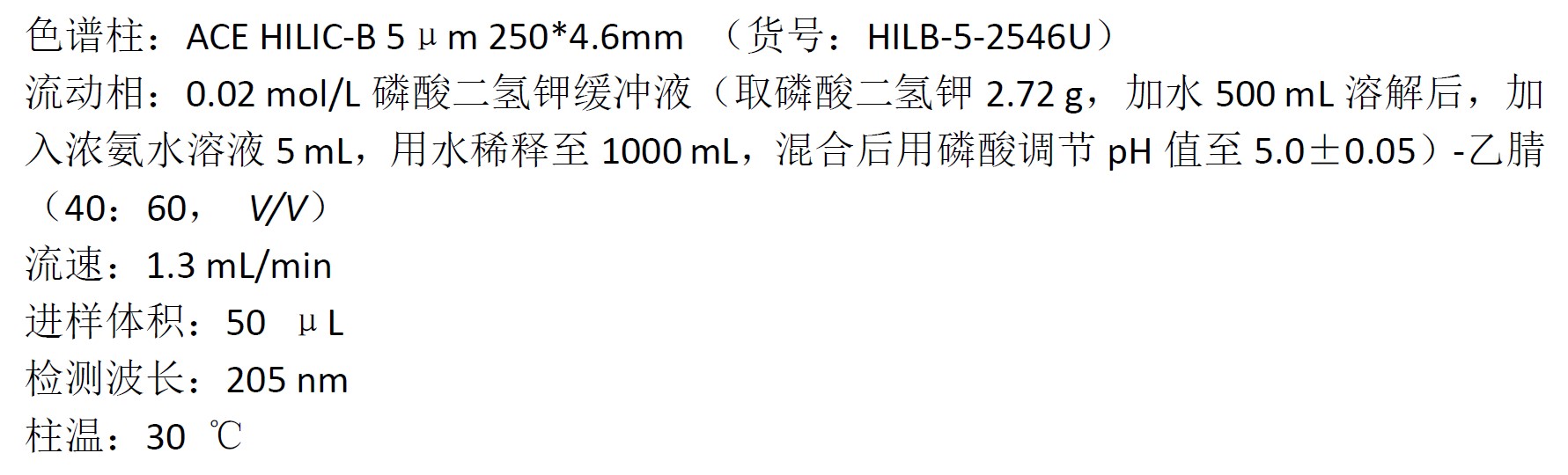 可以選用帶有HILIC作用的色譜柱實現保留,當使用磷酸鹽類時,可以在截止波長條件下用UV檢測,比較經典的應用是用ACE HILIC-B檢測門鳥氨酸: