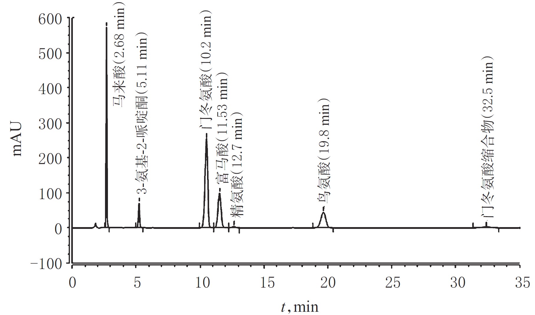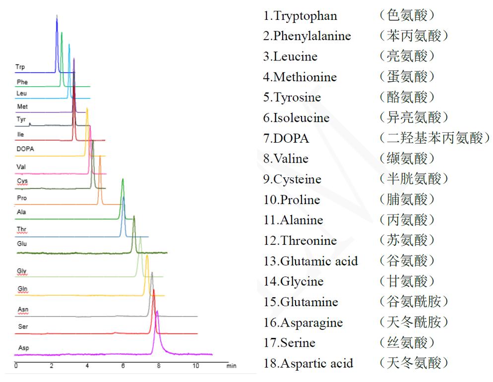 通過衍生反應在氨基酸上接上疏水且有紫外吸收的基團,可以實現在C18柱+反相流動相的體系下進行HPLC分析。