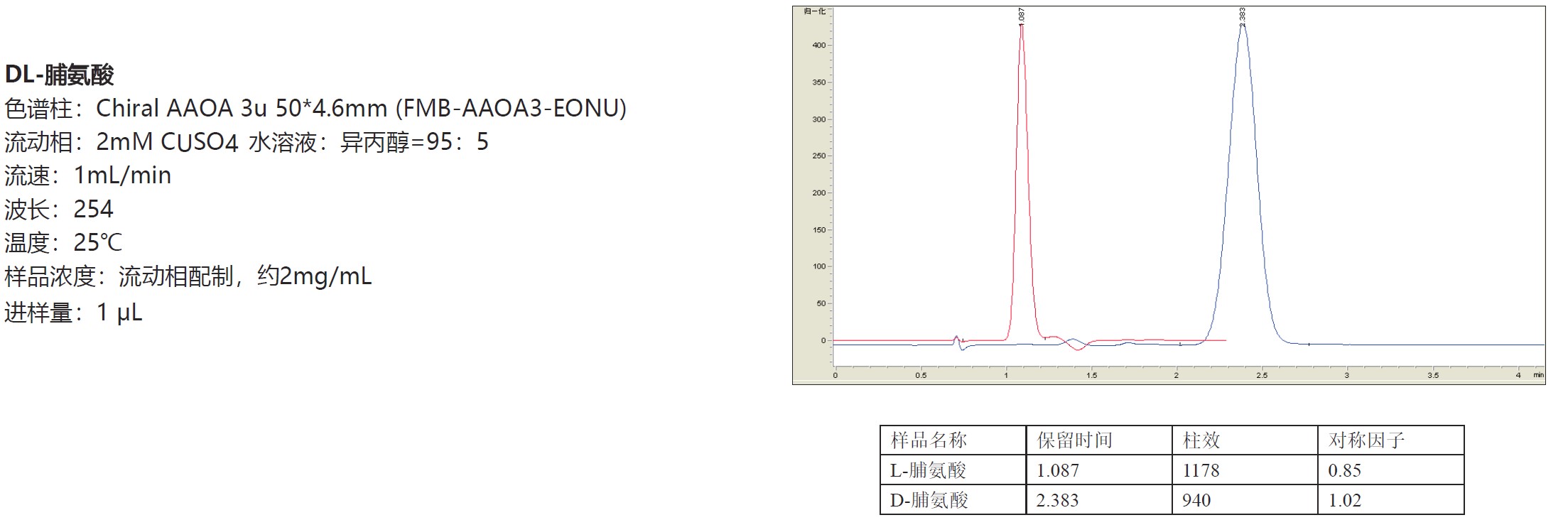對于非保護的氨基酸,菲羅門推出AAOA分析柱,即通過鍵合D-青霉胺于十八烷基柱上而成的配體交換型手性柱。該手性柱手性柱可以用于拆分α-型有機酸、α-型非衍生氨基酸及其衍生物、二元胺、二肽、內酰胺和氨基醇等。