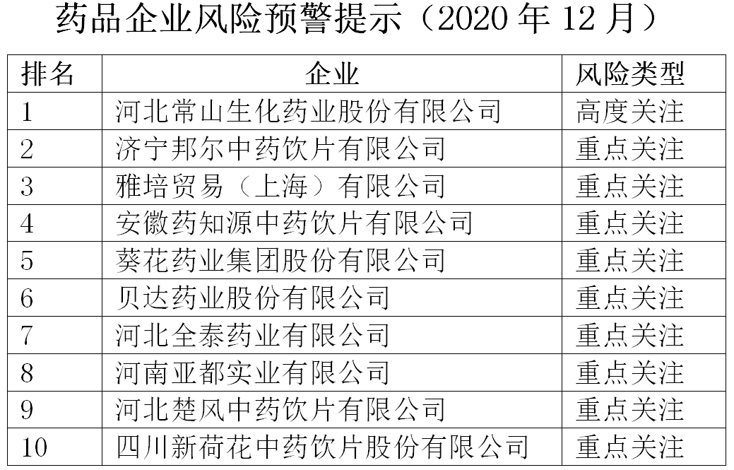近日,中國健康傳媒集團(tuán)輿情監(jiān)測中心發(fā)布藥品企業(yè)風(fēng)險(xiǎn)預(yù)警提示(2020年12月),公開風(fēng)險(xiǎn)指數(shù)排名前十的企業(yè)。河北常山生化藥業(yè)股份有限公司(以下簡稱常山藥業(yè))排名第一,為“高度關(guān)注企業(yè)”;濟(jì)寧邦爾中藥飲片有限公司、雅培貿(mào)易(上海)有限公司、安徽藥知源中藥飲片有限公司、葵花藥業(yè)集團(tuán)股份有限公司、貝達(dá)藥業(yè)股份有限公司、河北全泰藥業(yè)有限公司、河南亞都實(shí)業(yè)有限公司、河北楚風(fēng)中藥飲片有限公司、四川新荷花中藥飲片股份有限公司分列第2至10位,為“重點(diǎn)關(guān)注企業(yè)”。