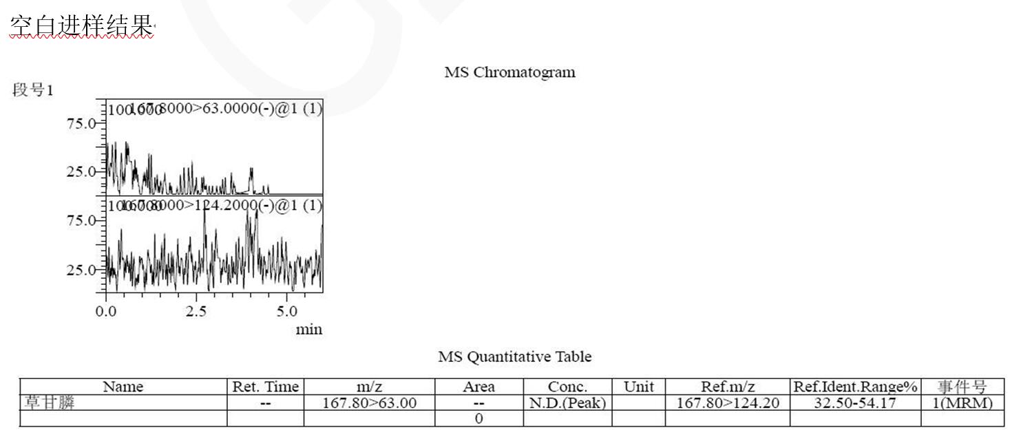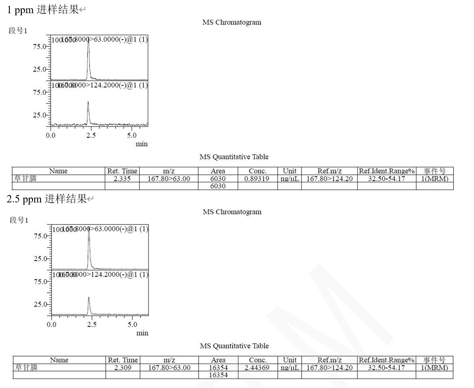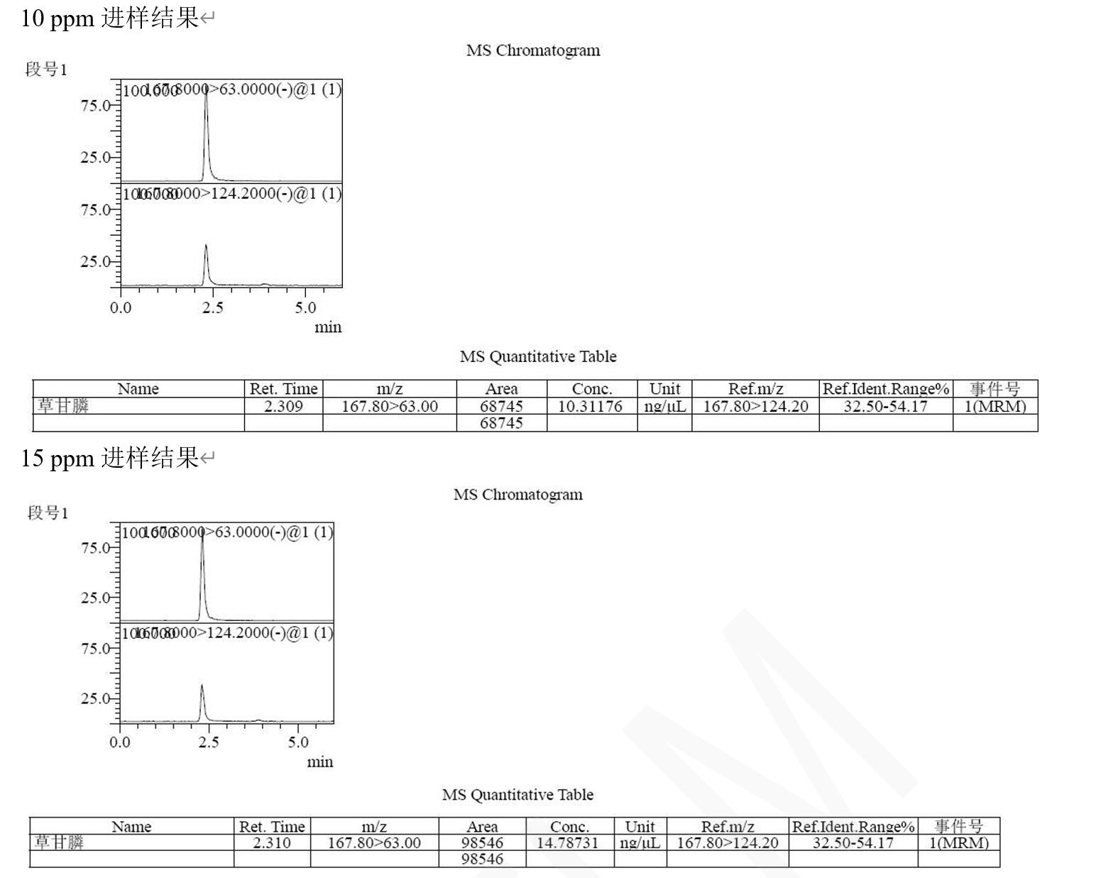 說明:本方法研究草甘膦不衍生直接檢測。相比于傳統(tǒng)衍生后用 C18 分析,或者用氨基柱不衍生 PH=10-11 條件下分析,帶來的復雜,耗時,以及氨基柱結(jié)果重現(xiàn)與壽命上的問題。此方法簡單,快速,方便。可滿足常規(guī)分析檢測需求以及多數(shù)殘留檢測需求。