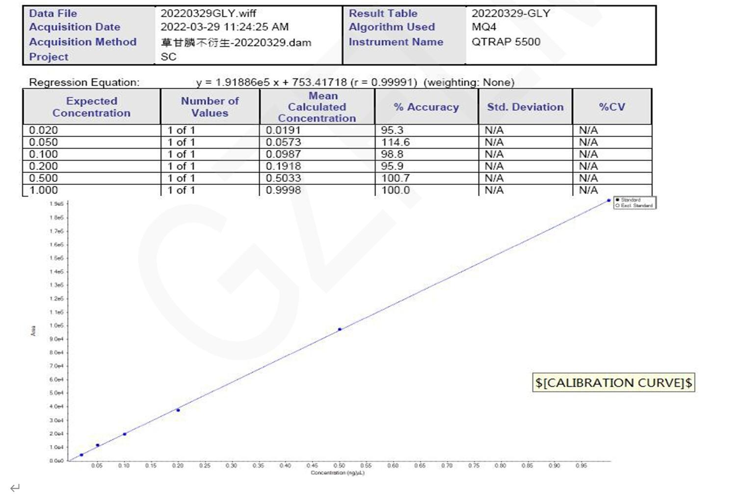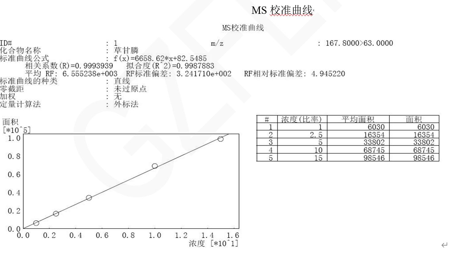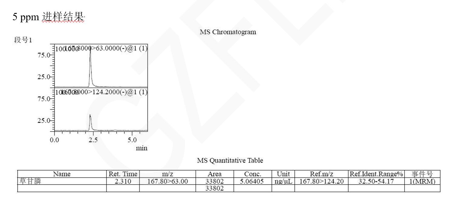說明:本方法研究草甘膦不衍生直接檢測。相比于傳統(tǒng)衍生后用 C18 分析,或者用氨基柱不衍生 PH=10-11 條件下分析,帶來的復雜,耗時,以及氨基柱結(jié)果重現(xiàn)與壽命上的問題。此方法簡單,快速,方便。可滿足常規(guī)分析檢測需求以及多數(shù)殘留檢測需求。