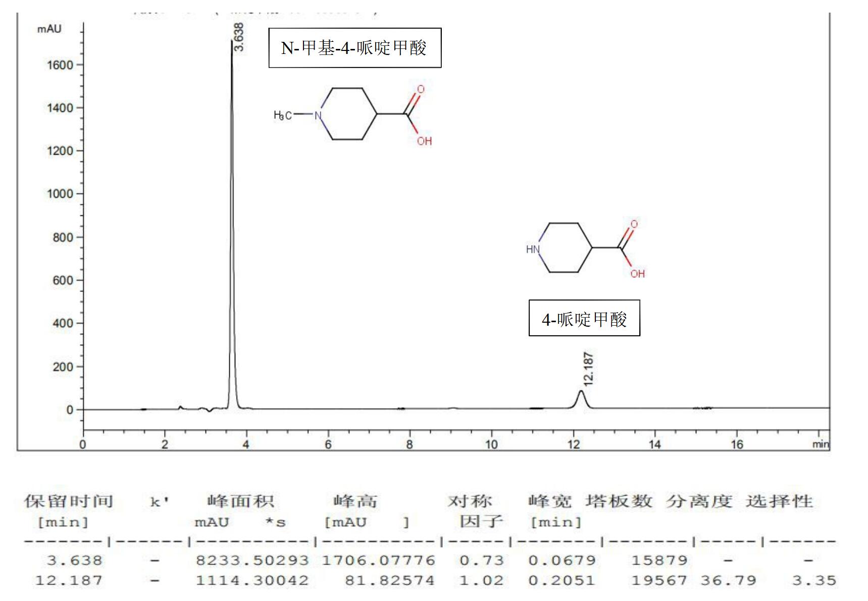 方法說明:N-甲基-4 哌啶甲酸與 4-哌啶甲酸之間相差一個(gè)甲基,該差異直接影響了哌啶環(huán)上氮原子接受質(zhì)子的能力,因此可以利用陽離子交換作用進(jìn)行保留及分離;由于兩者保留時(shí)間相差較大,后續(xù)調(diào)整亦可采用梯度洗脫來改善分析時(shí)間。