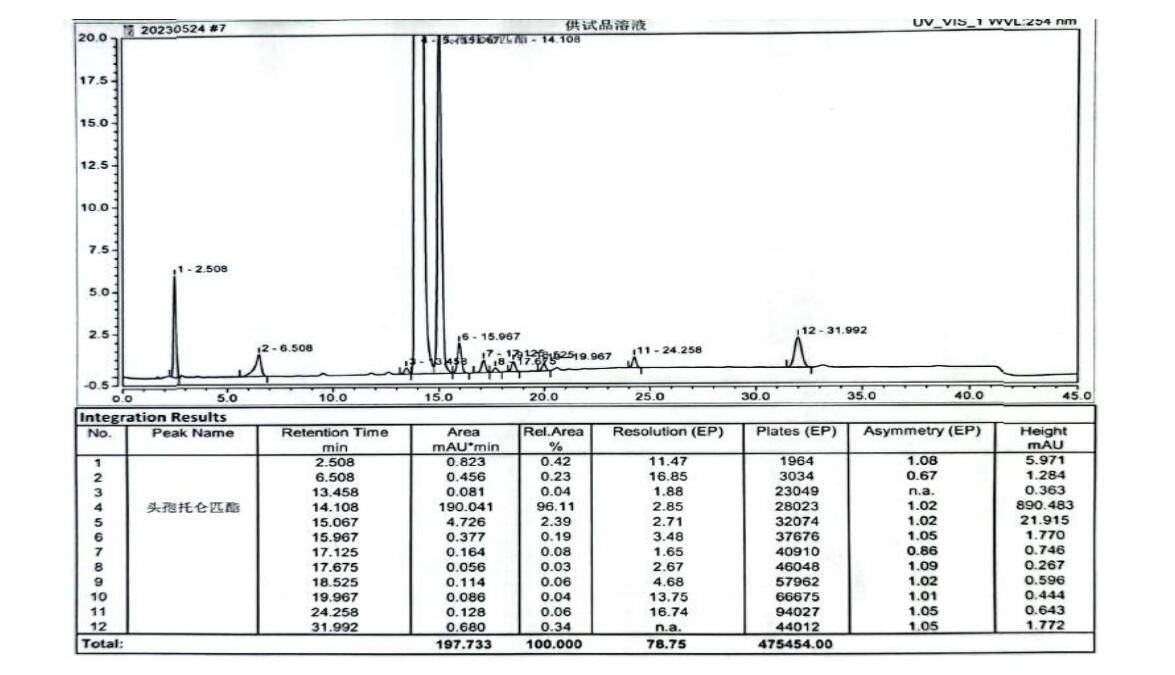 頭孢妥侖匹酯顆粒的檢測限為20 μg/ml,線性范圍為20-400 μg/ml,RSD不超過2%。該方法簡便、準(zhǔn)確、靈敏度高,可以用于頭孢妥侖匹酯顆粒的質(zhì)量控制和分析。