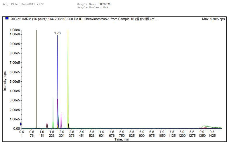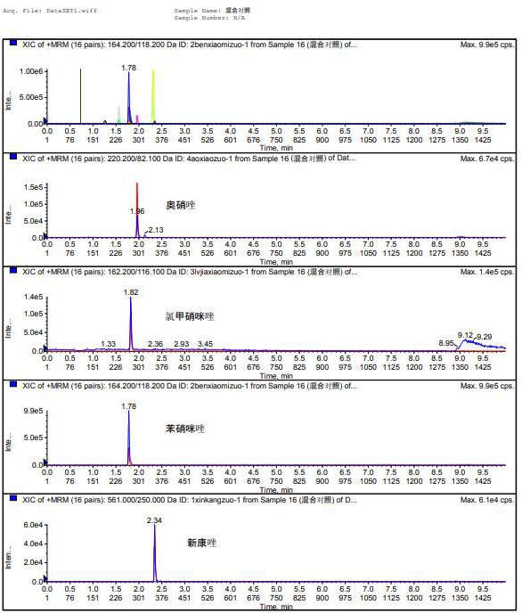使用該色譜柱進行分析 8 種混合對照圖譜以及各組分離子提取圖譜如下: