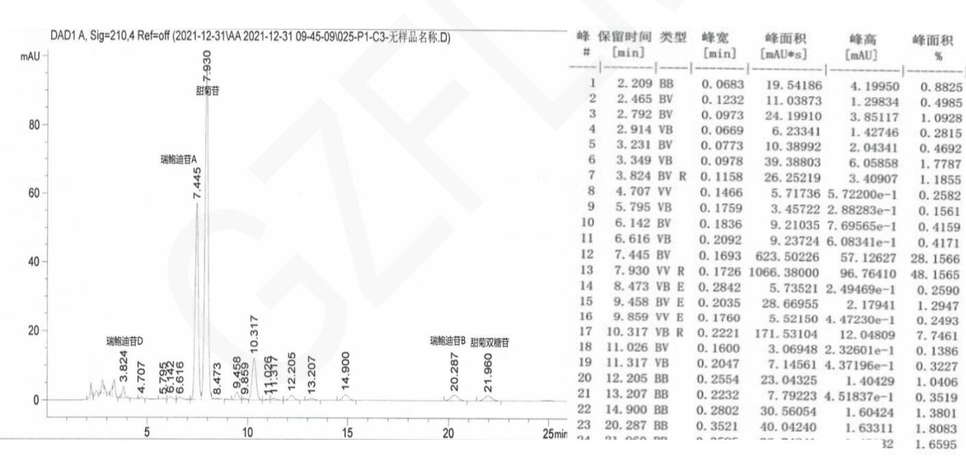 客戶評(píng)價(jià):所有峰均滿足分離度要求。其中,最大進(jìn)樣量下瑞鮑迪苷 A 與甜菊苷分離度 1.67(標(biāo)準(zhǔn)要求分離度 1.5)。若采用 Ttiank C18 3u 250*4.6mm 可獲得更大分離度。