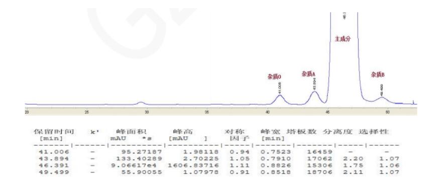方法說明:該款反相手性色譜柱相比其它的正相方法,采用簡單的反相流動相體系,更為實用方便。峰形對稱,柱效高。藥典要求理論板數按右布洛芬峰計算不低于 2000,右布洛芬峰與左布洛芬峰之間的分離度應大于3.0,此反相方法也完全符合藥典的指標要求。