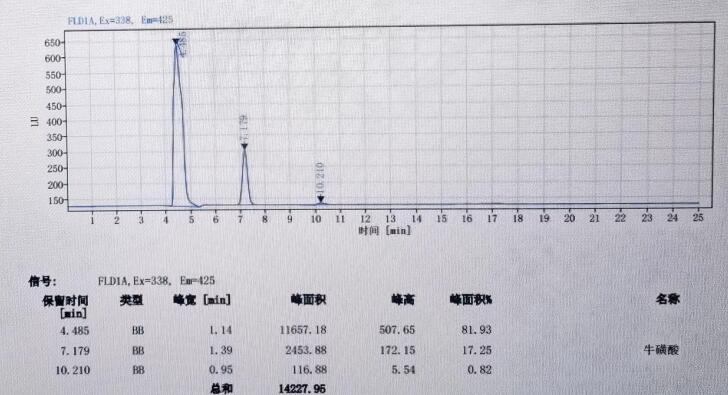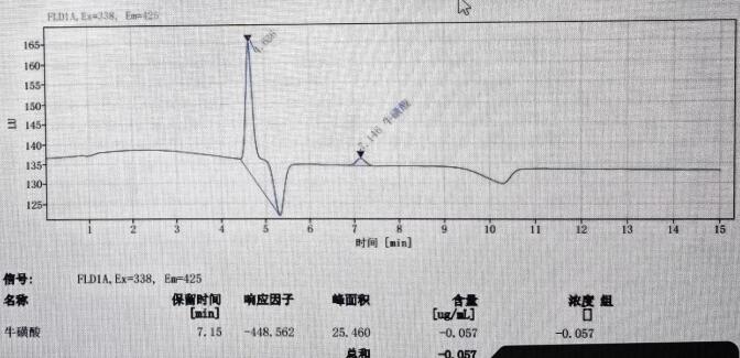 App ID: FLM-M240001 GB 5009.169-2016 食品中牛磺酸的測(cè)定 色譜柱:MARS MNa 5u,250*4.6mm(貨號(hào):FMG-1036-EONU) 流動(dòng)相:檸檬酸三鈉溶液(稱取19.6g 檸檬酸三鈉,加950mL 水溶解,加入1mL 苯酚,用硝酸調(diào)pH 至3.10-3.25, 經(jīng) 0.45um 微孔濾膜過(guò)濾。 流速:0.4mL/min 熒光衍生溶劑流速:0.3mL/min 檢測(cè)波長(zhǎng):激發(fā)波長(zhǎng):338nm, 發(fā)射波長(zhǎng):425nm 柱溫:55℃ 柱后衍生系統(tǒng):SSI Allchrom PCR6000 柱后衍生系統(tǒng) 檢測(cè)器:熒光檢測(cè)器進(jìn)樣量:20ul 樣品: