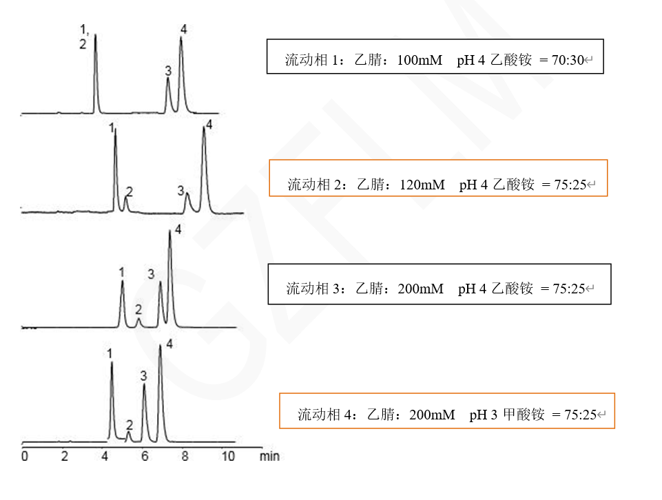 說(shuō)明:本案例中乙腈比例及緩沖鹽種類(lèi)和強(qiáng)度的變化帶來(lái)磷霉素與庶糖的0分離到完全分離的變化, 以及保留時(shí)間上的變化。類(lèi)似的雜質(zhì)也可通過(guò)此類(lèi)調(diào)整或者梯度調(diào)整條件,實(shí)現(xiàn)分離。 在液相中同時(shí)分析磷霉素、蔗糖、氨丁三醇及鈉離子是一個(gè)復(fù)雜的過(guò)程,因?yàn)檫@四種物質(zhì)在化學(xué)性質(zhì)、極性和保留行為上可能存在顯著差異。以下是一種可能的分析策略: