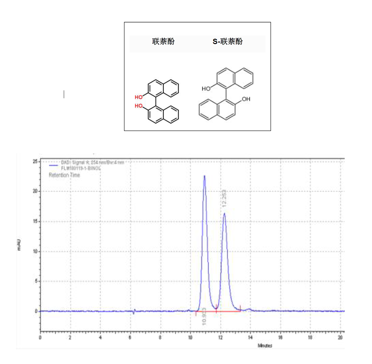 App ID: FLM-B250006 聯(lián)萘酚與S-聯(lián)萘酚的分離 色譜柱:Chiral INC 250*4.6mm,5um (貨號:FMG-JY5-I03) 流速:0.5 mL/min 檢測:波長254nm, 柱溫:25°C 樣品濃度:N/A 進(jìn)樣量:1μ 溶劑:水:甲醇=40:60(V:V) 流動相:咨詢銷售