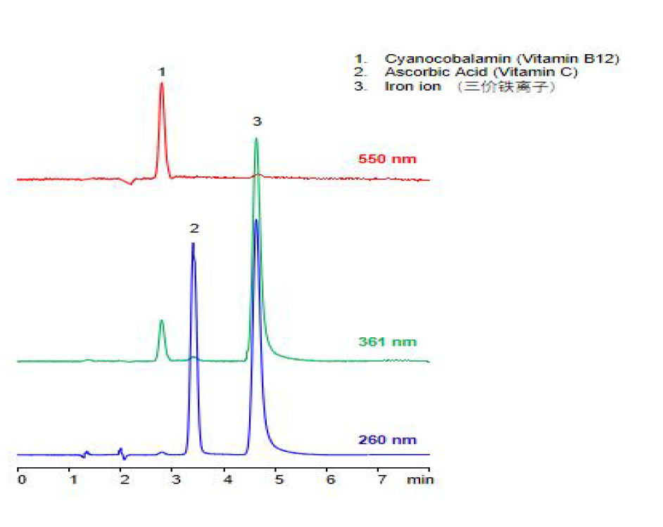 App ID: FLM-C250009 Comixsil HAX 對保健品配方中維生素C、維生素B12 以及硫酸亞鐵的HPLC-UV 法測定 色譜柱:Comixsil HAX 3u 150*2.1mm (貨號:FMF-HAX3-BONU) 方法:100ml 乙腈+600ml 水+300ml 100mM 甲酸銨(pH4.1) 流速:0.2 mL/min 檢測:260nm、360nm 和550nm 樣品濃度:維生素B12 0.005 mg/mL、維生素C 0.1mg/mL、三價鐵離子0.05mg/mL、EDTA 0.15mg/mL 進(jìn)樣量:1 μL