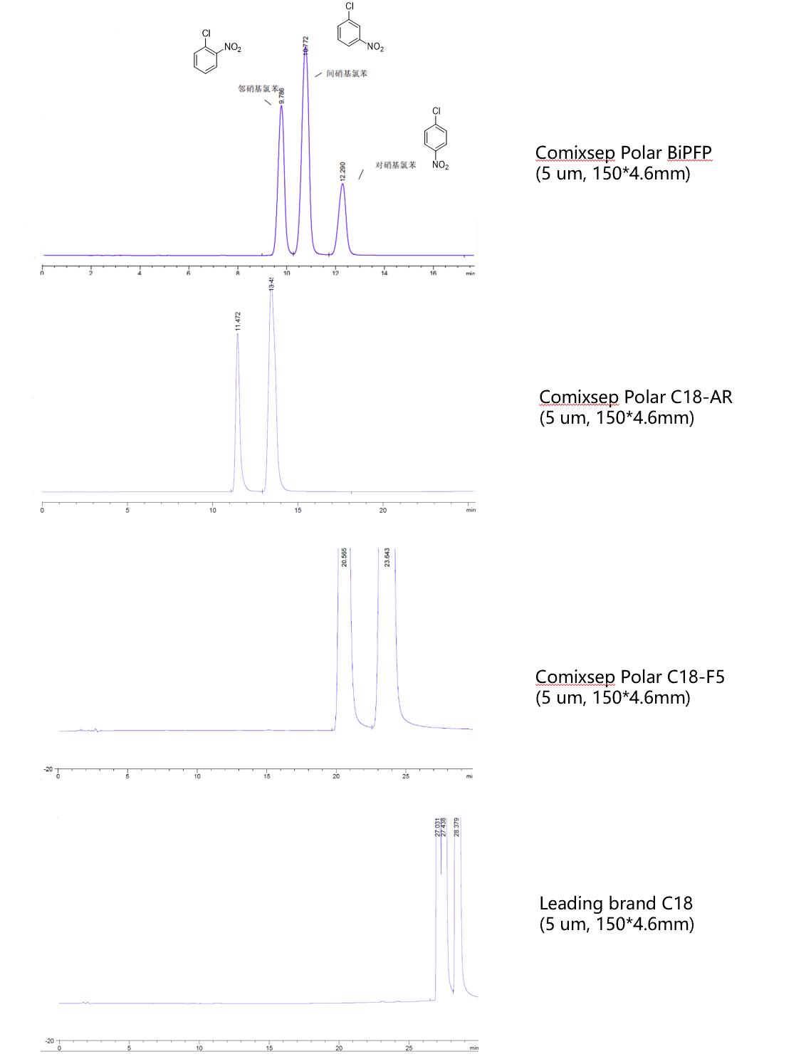 1. Comixsep系列色譜柱的分離效果在甲醇或者乙腈作為流動相中的有機相時具有很強的互補性,因此當使用Comixsep開發方法時盡量同時考察這兩種有機相;