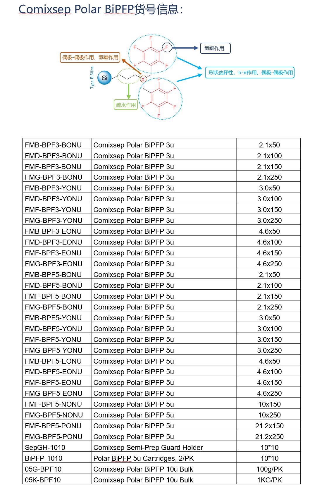 Comixsep復合反相固定相方法包為三款規格一致的互補固定相(Polar C18-F5, Polar C18-AR和Polar BiPFP)的組合,通過選擇性的科學互補,方便在HPLC方法開發時固定相的篩選,最大化提升方法開發的效率和成功率,是HPLC方法開發的有力工具。