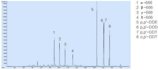八種農殘標準品:α-666(CAS: 319-84-6),β-666(CAS: 319-85-7),γ-666(CAS: 58-89-9), δ-666(CAS: 319-86-8),p,p'-DDE(CAS:72-55-9),p,p'-DDD(CAS:72-54-8),