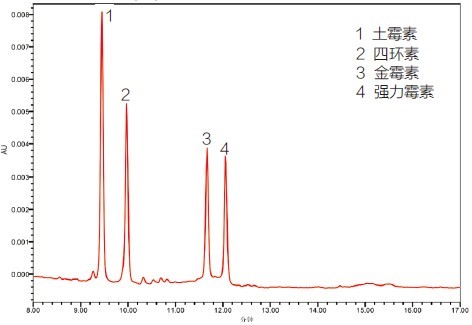 2、添加水平為0.8mg/kg牛奶基質中四環素檢測色譜圖