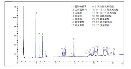 圖1 添加水平為0.2 mg/kg大米中有機氯和擬除蟲菊酯類農藥多殘留檢測色譜圖