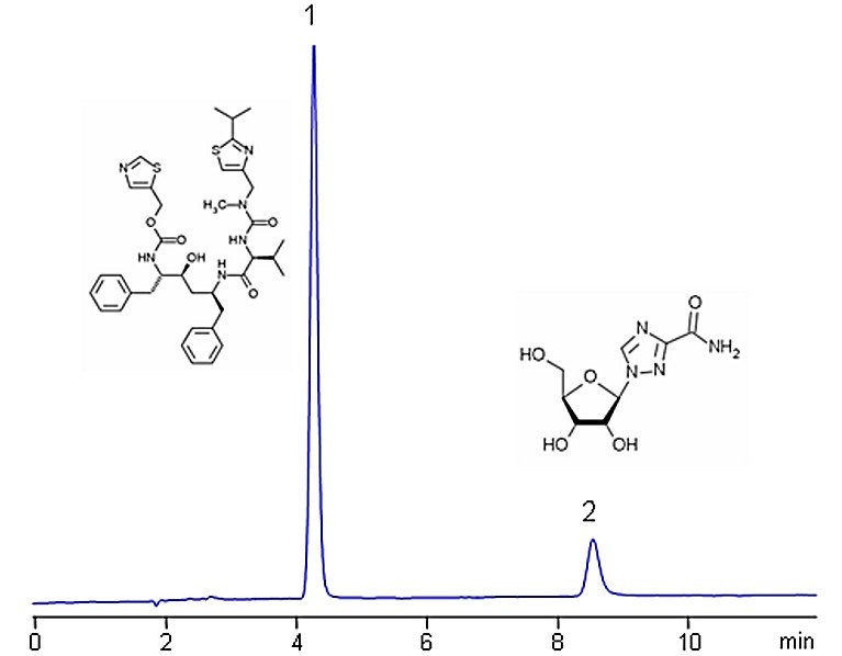 利托那韋是一種抗逆轉(zhuǎn)錄病毒藥物,屬于蛋白酶抑制劑類(lèi),用于治療 HIV 感染和 AIDS。利托那韋具有強(qiáng)疏水性且不可電離,它在反相色譜上保留過(guò)強(qiáng)。利巴韋林是一種抗病毒藥物, 可以有效對(duì)抗許多 DNA 和 RNA 病毒。利巴韋林屬于核苷酸抗代謝藥物,具有強(qiáng)親水性。對(duì)于 HPLC 分離,利托那韋和利巴韋林是兩種性質(zhì)差異非常大的藥物。可以采用親水作用色譜, 在 Primesep N 上對(duì)強(qiáng)疏水和強(qiáng)親水藥物進(jìn)行分離。