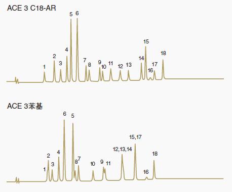 C18-AR可能具有其它不同的分離機(jī)制,可以為復(fù)雜的混合物帶來(lái)更好的分離效果。對(duì)于其他混合物,可能不是這種情況,這是ACE鍵合相的優(yōu)勢(shì)。