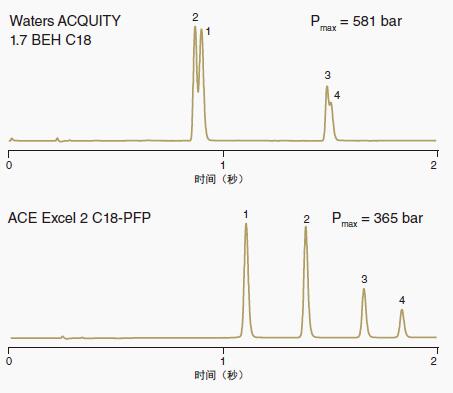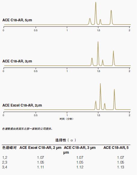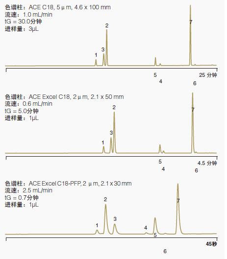 試驗(yàn)樣品的這些色譜圖在ACE Excel C18 2μmUHPLC色譜柱、ACE C18 3μmHPLC色譜柱和ACE C185μm色譜柱上以相同的流動(dòng)相條件運(yùn)行,結(jié)果闡明ACE固定相的選擇性一致,無(wú)論填充粒徑如何。