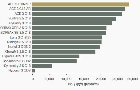 圖14闡明了當(dāng)使用相同的ACE鍵合相但不同粒徑填充的色譜柱進(jìn)行操作時(shí),可以預(yù)見到分析物一致的譜帶間距類型(選擇性)。