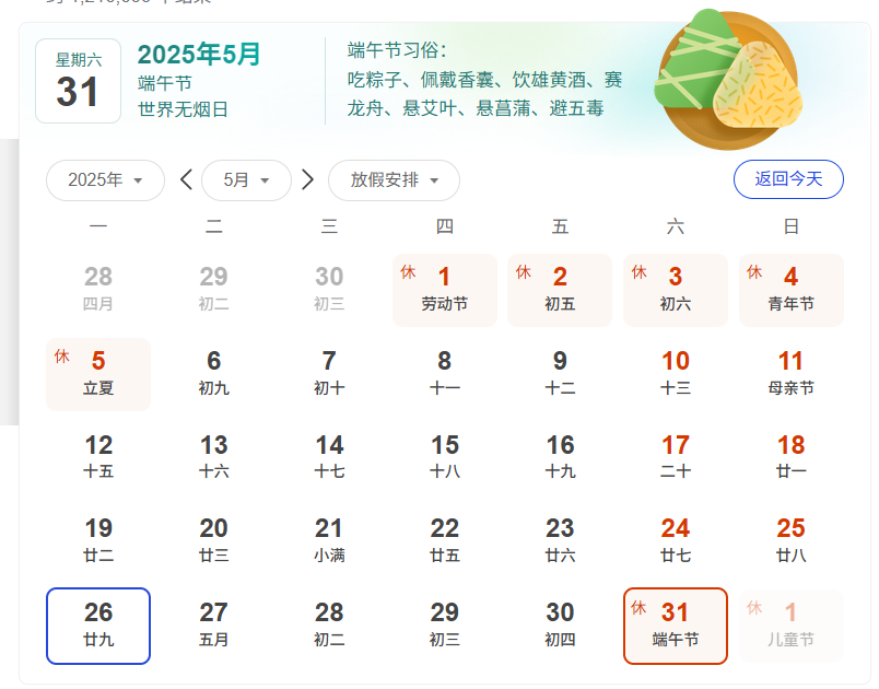 我司端午節放假時間為2025年5月31日至6月2日放假,共3天。
